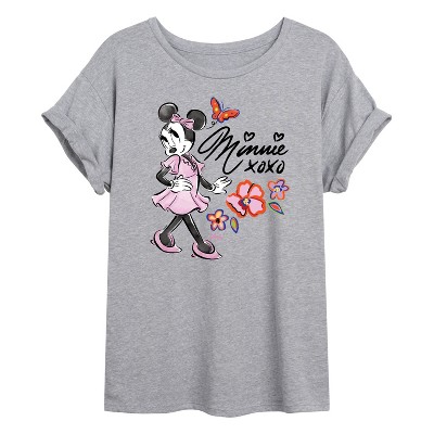 Women's Disney Minnie Mouse with Flowers & Butterflies Oversized Graphic T-Shirt - Heather Grey - Large