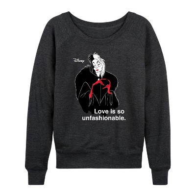 Women's Disney Villains De Vil, Ursula, Queen Grimhilde Lightweight French Terry Wide Neck Long Sleeve Graphic Shirt - Heather Charcoal - Medium