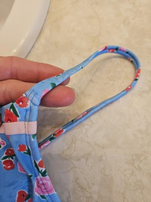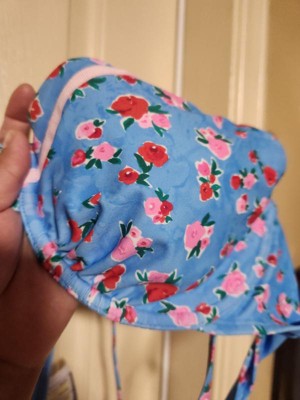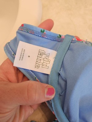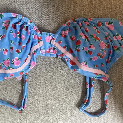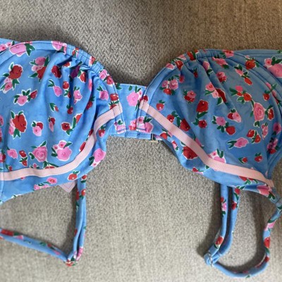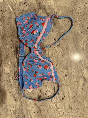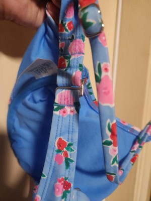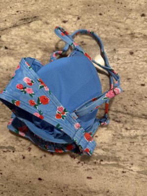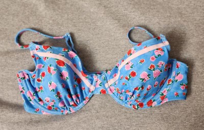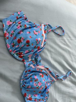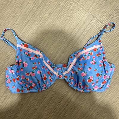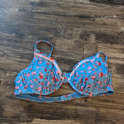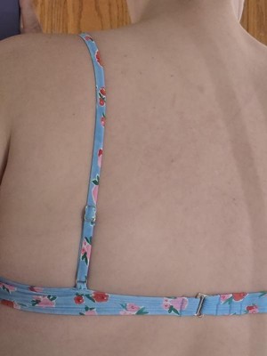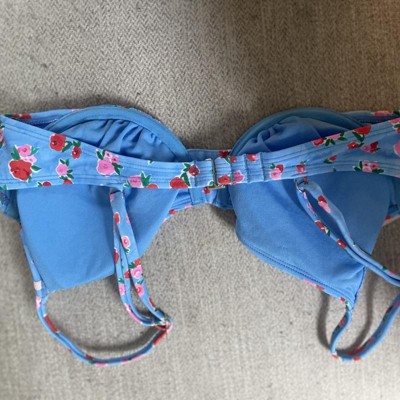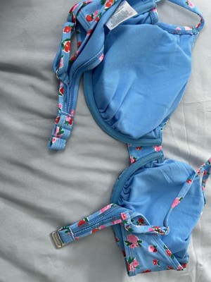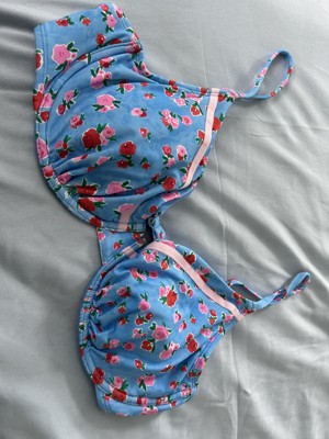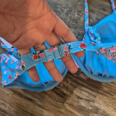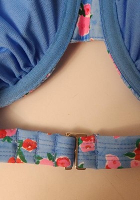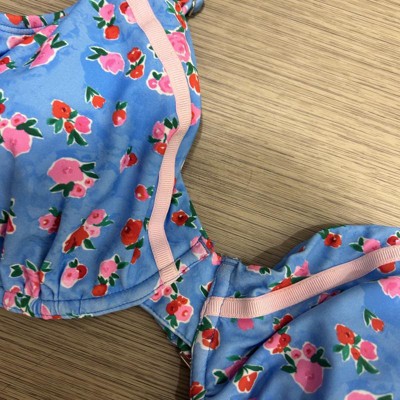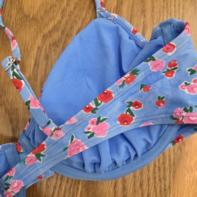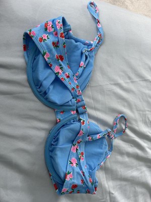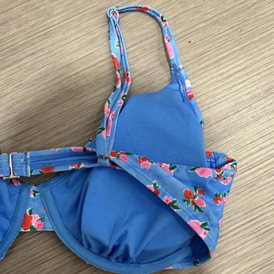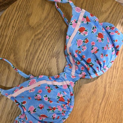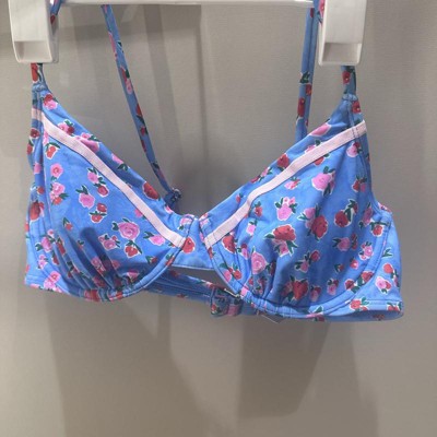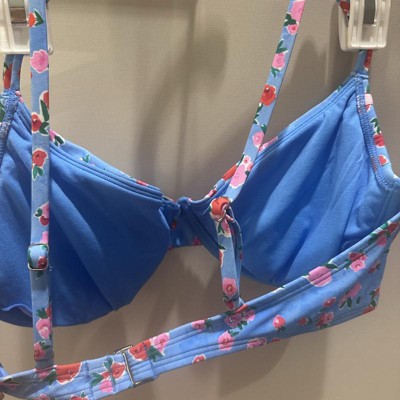 Blue bikini top from Wild Fable™ covered with ditsy floral print and ribbon detailing. Made of nylon-spandex blend fabric with four-way stretch for comfortable wear. Adjustable straps with back hook-and-loop fastener offer a nice fit. Removable cups with an underwired design help provide support and customizable coverage.