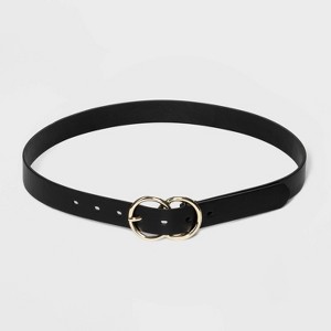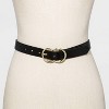 A: The belt features a double buckle closure with a shiny finish.