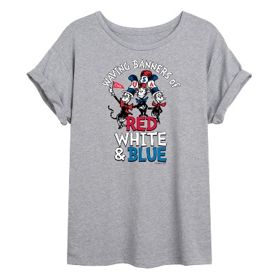 Dr. Seuss - Cat in the Hat Waving Banners Red White Blue - Women's Oversized T-Shirt - Our collection of graphic apparel featuring officially licensed Dr. Seuss characters brings the whimsy and wonder of Seussville straight into your wardrobe. From the mischievous Cat in the Hat to the stinky Grinch, each design showcases iconic characters and scenes from Dr. Seuss's timeless stories.