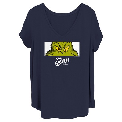 Welcome to the fantastical world of Dr. Seuss! Celebrate the beloved childhood classic books and movies from every generation with fun new officially licensed apparel for the entire family! This Women's Plus Size Dr. Seuss Grinch Eyes Graphic Scoop Hem T-Shirt features a close-up cropped panel of Grinch's yellow eyes across the front with the book title logo below. Get ready for the rhyming and whimsy of Seussville with these classic tees today!