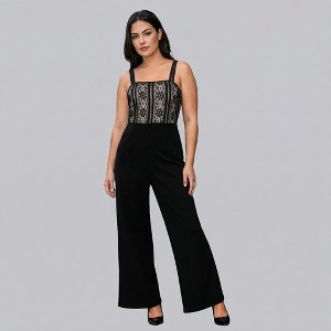 Exude effortless glamour in this stunning black jumpsuit featuring an intricate lace crochet bodice and sleek, flattering silhouette. The spaghetti straps and sweetheart neckline create a chic, feminine look perfect for evening occasions. Crafted with a stretchy and comfortable fabric, this jumpsuit offers both style and wearability. Dress it up with heels and statement jewelry for a night out or pair it with sandals for a chic daytime ensemble. Product code: CAA13E5M005AA