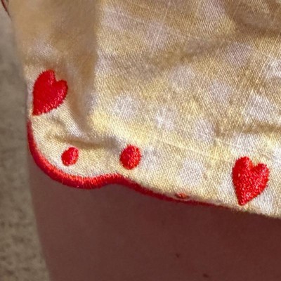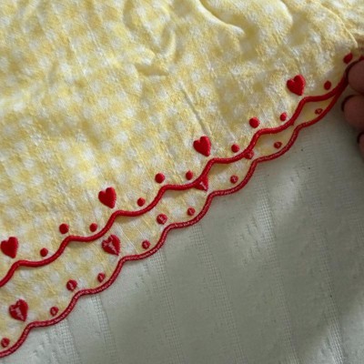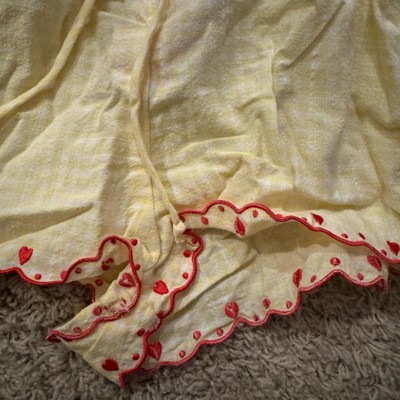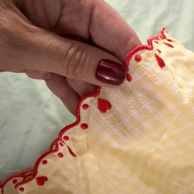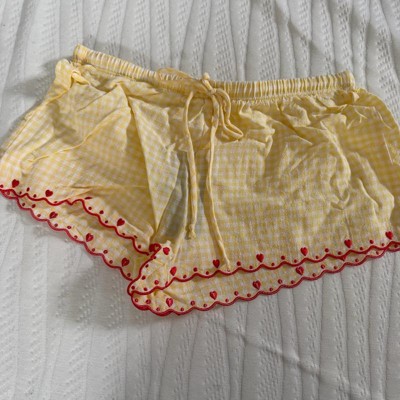 Yellow gingham cover-up shorts with red-trimmed scalloped hem featuring embroidered hearts and dots. Made from cotton-rayon blend fabric for all-day comfort. Feature a drawstring waistband for personalized, stay-put fit.