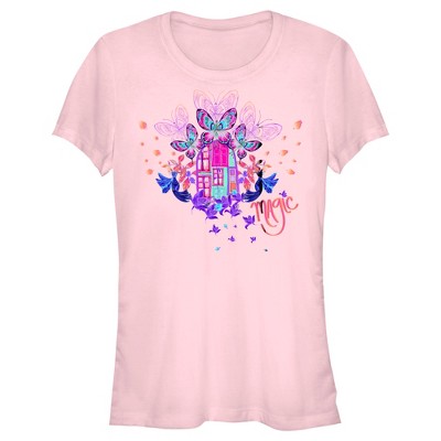 • Brightly colored butterflies are portrayed alongside Mirabel's glasses on this artistic Disney style with the text "Hi Casita" and "Magic with Encanto" across the front.