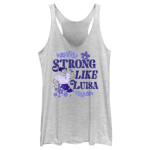 Join the Madrigal family for some magical and musical fun in the mountains of Colombia in Disney's new hit film Encanto! This officially licensed Women's Strong Like Luisa Ornate Flower Racerback Tank Top features an adorable, purple graphic of Luisa Madrigal and the phrase "Strong Like Luisa" surrounded by a floral pattern. Grab this new tank today and show your love for your new favorite Disney movie!