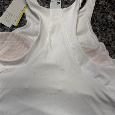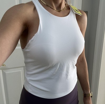 I really like the high neck and curved shape of the tank! The material is stretchy and comfortable to wear as an undershirt throughout the day or while strength training upper body. The padding is thick enough to conceal during cold temps and the white color stays vibrant through washes.