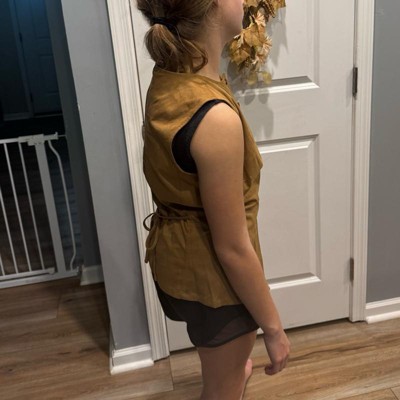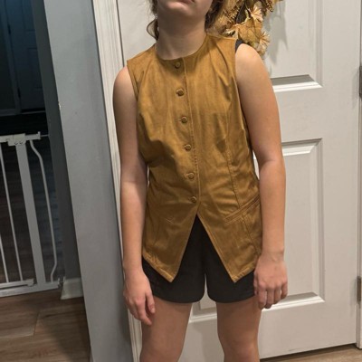 [This review was collected as part of a promotion.] We were obsessed with this great light brown suede vest. My 12-year-old daughter is pictured her wearing a size small she is about 4 foot 11 and weighs about 100 pounds and overall this fit her very true to size. It was easy to get on and off and we really like the tie in the back which allowed her to send it if she needed to pair nicely with a skirt and a light jacket over top for a complete head to toe look