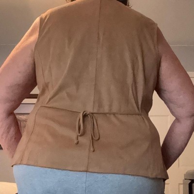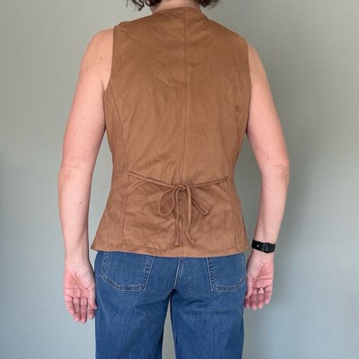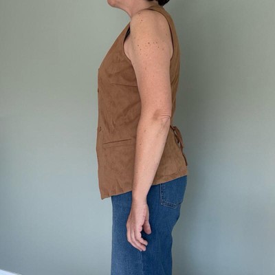 [This review was collected as part of a promotion.] I purchased this women's vest online. This brown faux suede vest is super cute and looks cute paired with slacks, jeans, or a skirt. It can be worn buttoned up on its own or open over another top. I bought this to take with me on a trip to Texas. It looks really good with a skirt and cowboy boots. I like the v at the bottom of the vest, but I don't really love the ties in the back. It's not a deal breaker for me, but I wish they weren't there. This fits true to size and it's reasonably priced. I'm wearing a size small which is my usual size. I typically wear a small in tops and jackets. I'm 5'4" and am a 34B. Overall, I'm very happy with this vest.