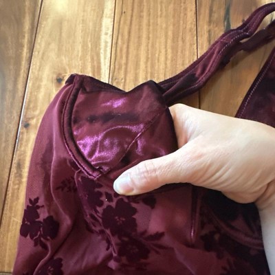 [This review was collected as part of a promotion.] What a beautiful lingerie slip dress this is! I tried this in size medium in the berry red color. It fits beautifully and true to size. The velour details on the flowers and on the chest area feel luxurious. The straps are adjustable and there is a back loop and hook closure just like a bra however the cups are not lined. It is soft and moves with you. It also has a flattering deep v neck.