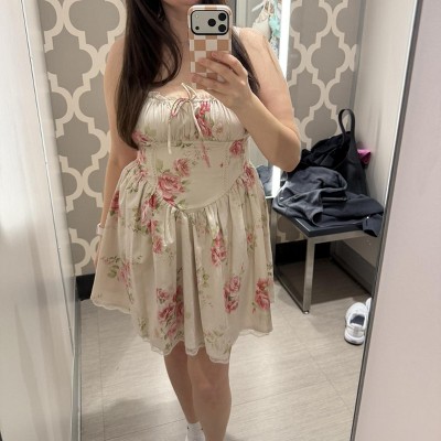Corset fit and flare mini dress from Wild Fable™ adorned with a floral pattern and lace accents. Features a keyhole neckline with tie detailing, a sleeveless silhouette, adjustable straps and a smocked back. Made from lightweight twill cotton fabric for all-day breathable comfort.