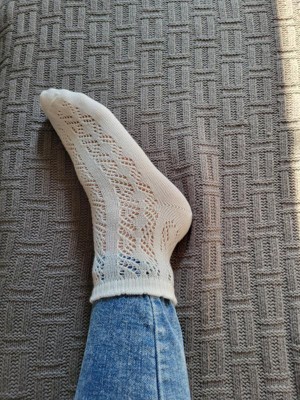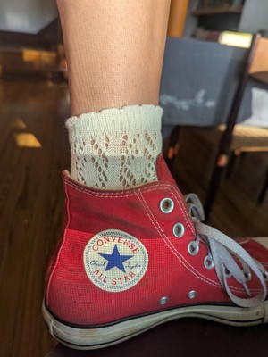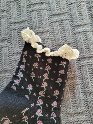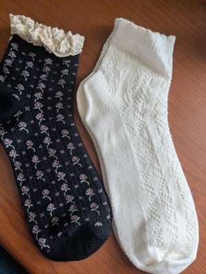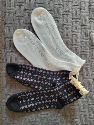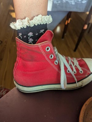 These are some of the sweetest socks I've ever owned. The ruffles on the black floral pair perfectly peak out of my high tops and the cream pointelle socks are incredibly soft. I think these would look adorable paired with heeled clogs! I wear a size 7 shoe and the 4-10 size fits just right.