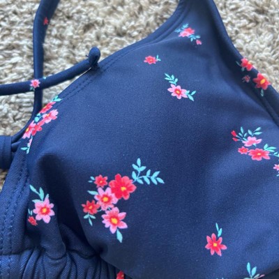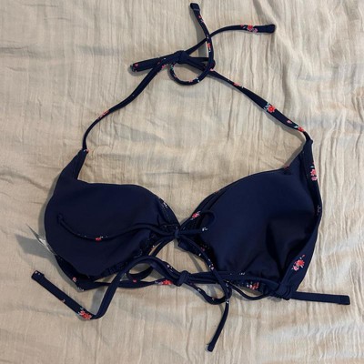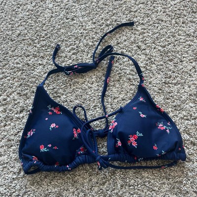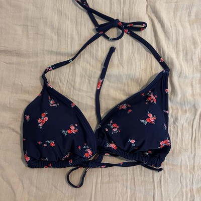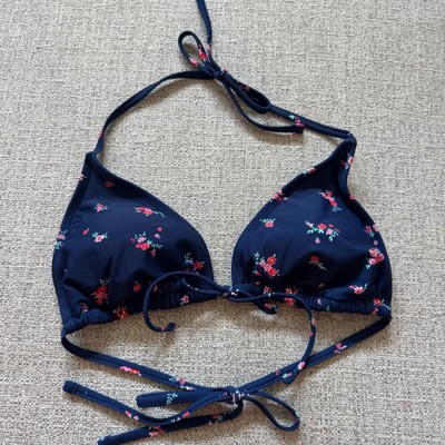 Triangle bikini top from Wild Fable™ with a front-tie accent. Adorned with vibrant floral prints against a navy blue backdrop. Made from nylon fabric with spandex and full lining for flexible comfort in and out of the water. Adjustable back and behind-neck ties complete the look and provide a customizable fit.