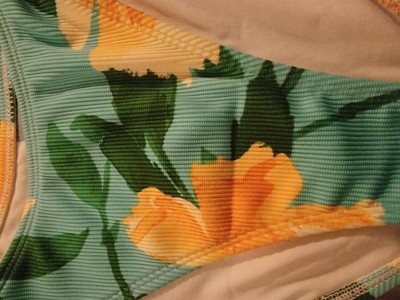 Gorgeous floral print design, perfect for beach as well as summer pool days. Feels like good quality ribbed material, which has held up through several washes so far. Has a fun tropical design/pattern. Bikini bottom has high leg cuts/medium front coverage.