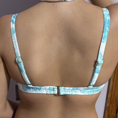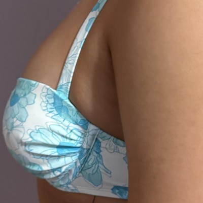 [This review was collected as part of a promotion.] My sister has this beautiful bikini top in a size 36c. She’s five foot six inches tall and 150lbs. This top fits her great. The color is white with a light blue floral pattern. The shoulder straps are adjustable for a comfortable fit. There is a clap in the back for closure of the top. This washes and dries easily and is really great for water activities. I definitely recommend this top. I received an incentive to write this review.