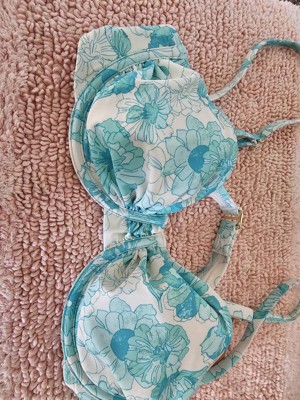 The Women's Floral Print Shirred Balconette Underwire Bikini Top - Shade & Shore in blue and is comfy. It has an underwire, adjustable straps, and removable cups for coverage. The floral pattern is cute and looks great with matching or solid color bottoms.