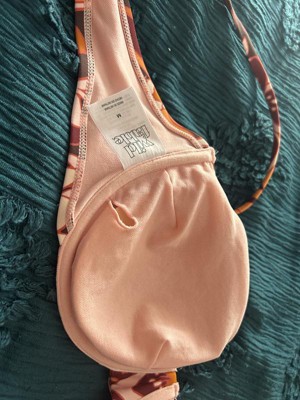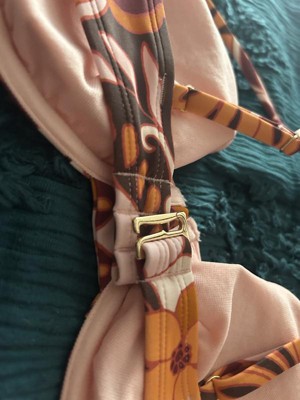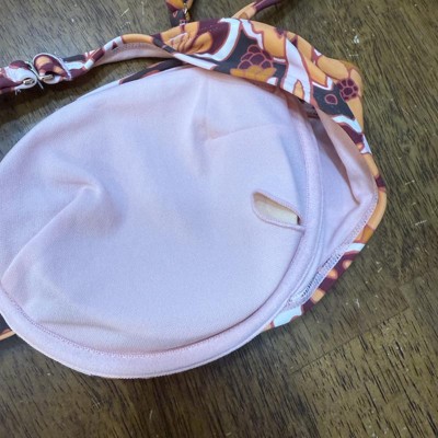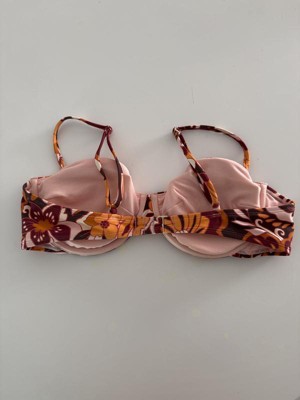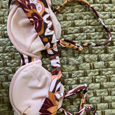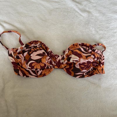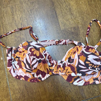 Women's Balconette Underwire Bikini Top - Wild Fable™ Brown Floral This bikini top comes in a floral print of brown, orange, burgundy, and peach for a bright pop; a matching bottom is available. The versatile styling offers removable cups, an adjustable back hook (gold), adjustable sewn in straps, and supportive underwire with full cup coverage. It is made from 82% Nylon, 18% Spandex, and is fully lined with 100% recycled polyester, in a condinating peach (for good coverage). This makes a great addition to your summer beach/pool/fun wardrobe!