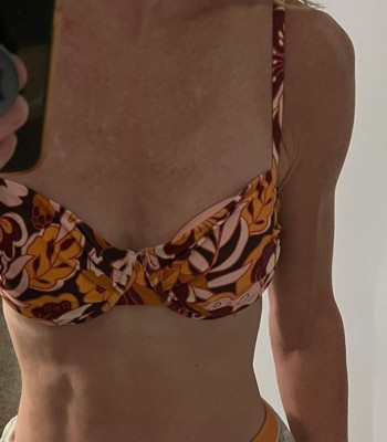 [This review was collected as part of a promotion.] This is the Wild Fable Women’s floral print underwire bikini top in brown size small. I am 5’4” 140# and wear a small 34C. I should have sized up to a medium for the cup size but by taking out the removable cup pads, that helped a lot and I fit just fine. I like the underwire and the adjustable straps. I’m not overly fond of the print - I will be returning it due to the print. I do recommend this product though! I received an incentive to write this review.