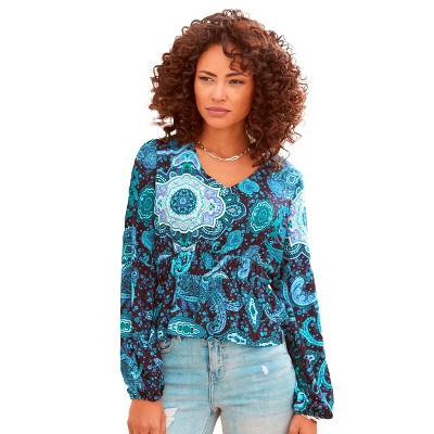This airy, loose blouse is just right for you! * Long sleeves with elastic cuffs * Wide-cut shape * Front button placket * Yoke at the back * Length approx. 26.75 inches * Viscose. Imported. * Machine washable