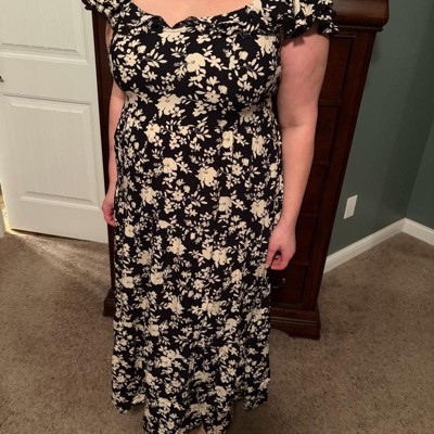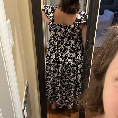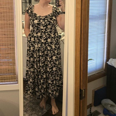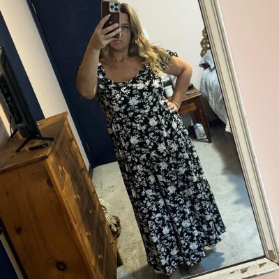 Add fresh, flowy charm to your wardrobe with this Flutter Cap-Sleeve Tiered Maxi A-Line Dress from Ava & Viv™. The tiered A-line maxi dress features a white seamless floral print on black drop for a bright look. A sweetheart neckline and flutter cap sleeves add charming detail, while the smocked back ensures a comfortable, flexible fit. Crafted from lightweight rayon fabric, this dress provides breezy comfort for all-day wear, and it's finished with side pockets for keeping essentials close at hand.