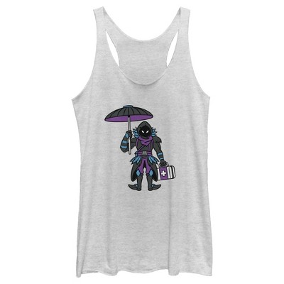 • Strut your stuff with this stylish new women's graphic racerback tank top that is perfect for every occasion! Featuring the words: "Victory Royale," with the brooding master of dark skies, Raven, holding a medkit and an umbrella across the front.