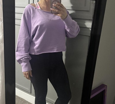 So first, the color of this is divine! Is a deep lavender in person but hues more towards a pink than blue. It's gorgeous. My problem is that it's cropped, which I knew.. but it's a more exaggerated crop style instead of the boxy cut crop. I have a long torso and am 5'9. I bought a large and this hangs almost above my belly button. I will probably get an XL, although I feel it may be too oversized everywhere else. All in all, a pretty shirt just not for me.
