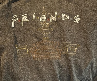 The shirt is comfy and fits as expected but the couch and fountain graphic are barely there, you can only see the friends part. It actually looks brighter in the photo I took than it actually is.