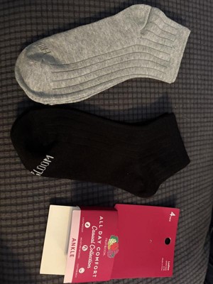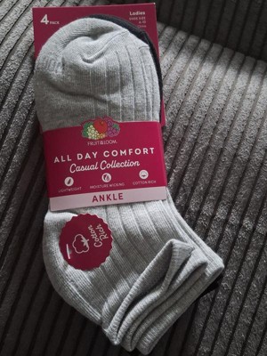 Fruit of the Loom All day comfort casual collection ankle high socks are a great set of socks. These are a 4 pack of ladies size 4-10 ( shoe size). Two gray & two black pairs . They're breathable & very comfortable. They fit perfectly. True to size. I love that I wear them all day long - & they funny roll down or bunch. These socks are moisture wicking , definitely a plus especially after a day of long walking. Made to last & made very well. I do love that these socks are perfect for the warmer weather, not too thick in size. Good value. I would definitely recommend fruit of the loom all day comfort casual collection if you're looking for a very comfortable sock.