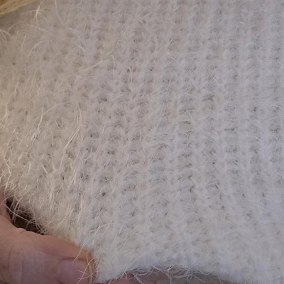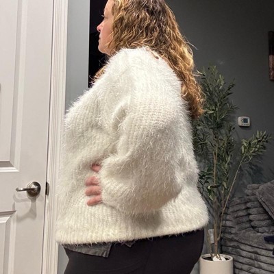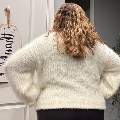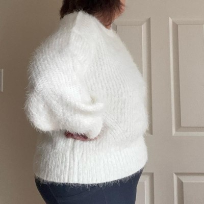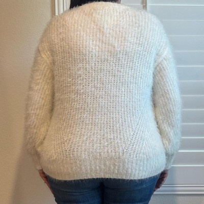 [This review was collected as part of a promotion.] This sweater literally resembles the snow. It has long, soft fuzzy strands. It is a beautiful white color and can be dressed up or down with jeans or with a beautiful pair of leather pants or slacks. I’m typically a size 12 and I ordered this in an extra extra large. I love how comfy, cozy and roomy it was without being too oversized