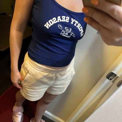 Game Day graphic cami from Wild Fable™ in a solid shade. Adorned with a "Sporty Season" graphic with a bear playing rugby on the front. Features a scoop neckline and slender straps. Tailored in a slim-fit silhouette with a mid-length hem. Made of a midweight jersey fabric blend of cotton, recycled polyester and spandex for comfortable, flexible wear that moves and stretches with you.