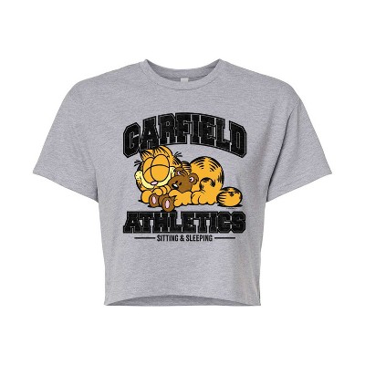 Garfield - Athletics Couch Potato Division - Juniors Cropped Cotton Blend T-Shirt - Bring the humor and laziness of the famous orange cat to your wardrobe with Garfield graphic apparel. Featuring Garfield, Odie, and Jon, these designs celebrate the iconic comic strip and its beloved characters.