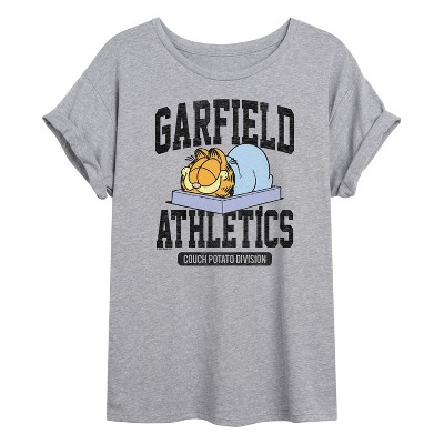 Garfield - Athletics Couch Potato Division - Women's Short Sleeve Graphic T-Shirt - Bring the humor and laziness of the famous orange cat to your wardrobe with Garfield graphic apparel. Featuring Garfield, Odie, and Jon, these designs celebrate the iconic comic strip and its beloved characters.