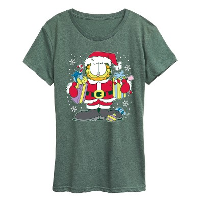 Garfield - Santa - Women's Short Sleeve Graphic T-Shirt - Bring the humor and laziness of the famous orange cat to your wardrobe with Garfield graphic apparel. Featuring Garfield, Odie, and Jon, these designs celebrate the iconic comic strip and its beloved characters.
