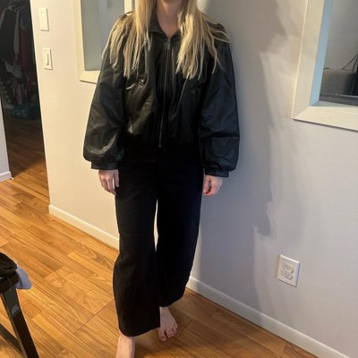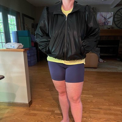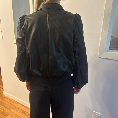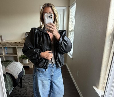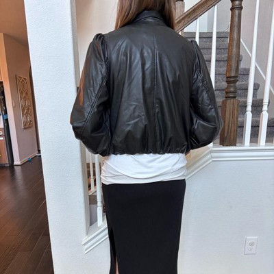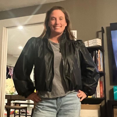 [This review was collected as part of a promotion.] I am wearing a size extra large in this gathered bomber jacket from Universal thread. This is we made from lightweight fabric material and pleather. I love the details on the sleeves with the puffed shoulders. This sipped easy it is a crop length. Super cute in the winner paired with leggings and boots . I am normally a size 10/12. This was a little big, but I like that feel. I received an incentive to write this review.