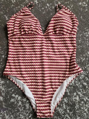 When I think of red, this is not what comes to mind. This Women's Geo Jacquard Full Coverage One Piece Swimsuit - Shade & Shore™ in Red Multicolor runs a little small. The print is not something I would choose. The midsection does have great compression for the tummy. Advertised as full coverage and I would say it’s more medium coverage(possible skewed because it runs small).