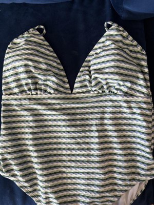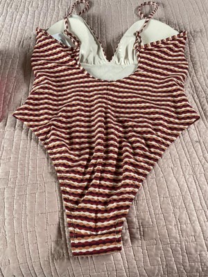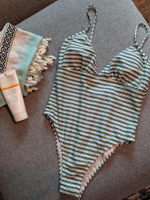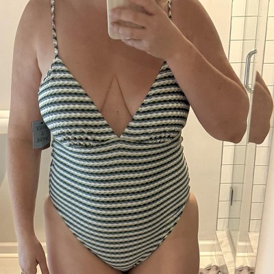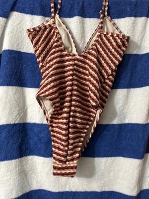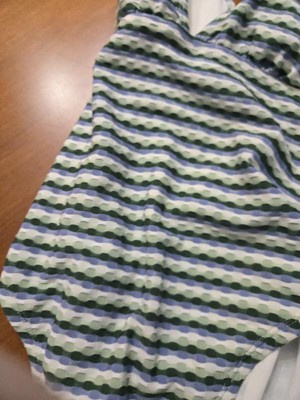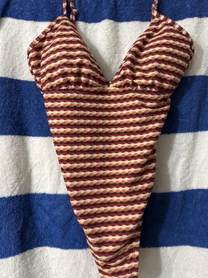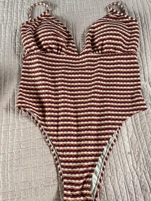 This suit is comfortable, stretchy, and soft. I love the soft texture print, the horizontal stripes, and the color combination. I like that it is a one piece suit. The high leg and cheeky back make this suit sexy while maintaining comfort and the ability to be active while wearing this suit.