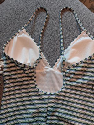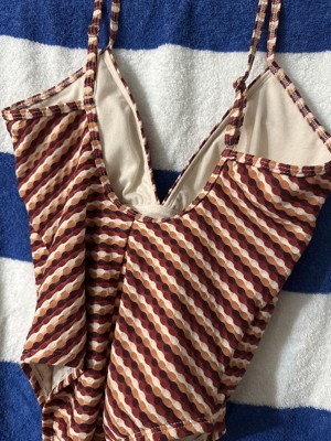 I think the pattern and fabric of this suit is really cute and unique. Unfortunately, that’s all I like about it. It’s too short, so the cups don’t fit in the right place, even with the straps loosened. The straps are thin and don’t stay up. The legs are very high cut, and it’s just a weird fit and an unflattering suit.