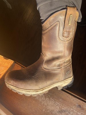 Feel the comfort of the Georgia Boot Eagle Trail women's waterproof pull-on work boot. This 10-inch boot is full-grain leather with a high-performing mesh lining and leather pull straps for an easy pull-on. Equipped with the Georgia Waterproof System, your feet will stay dry in the wettest conditions. Built with a flexible cement construction, this light brown boot features a fiberglass shank for added support and a removable Quick Response polyurethane foam comfort insole. The outsole is heat, , abrasion, and slip-resisting dual-density EVA and Carbo-Tec Rubber outsole.