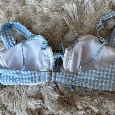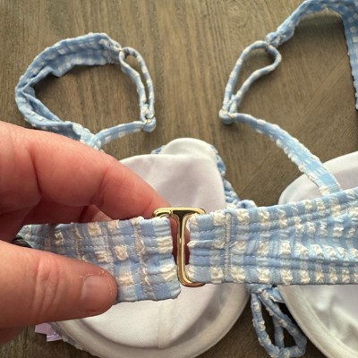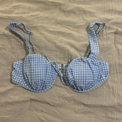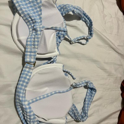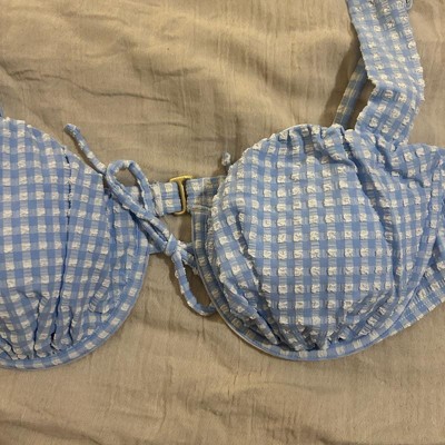 [This review was collected as part of a promotion.] This adorable seersucker underwire bikini top by wild fable is adorned with a beautiful baby blue gingham pattern, and a Thai accent at the center front. The cups are so cute. They almost look like a little seashells my most favorite part of this bikini top is the straps they are wide and spread in the front and then regular spaghetti in the back and adjustable. I’m typically a size 12 to 14 I ordered this in a size extra large and it fit perfect.