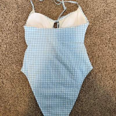 [This review was collected as part of a promotion.] This is the wild fable women’s gingham seersucker extra high leg, extra cheeky, Thai front one piece swimsuit in color blue/white, and in size small. I am 5’4” tall and about 135 pounds. I typically wear a size small // 4-6. The swimsuit fits true to size. It’s very flattering and I love the halter neck style. The cute keyhole cut outs at a fun effect to the swim swimsuit. I do recommend the swim swimsuit.