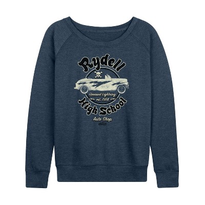 Women's Grease T Birds Lightweight French Terry Wide Neck Long Sleeve Graphic Shirt - Heather Indigo - Large