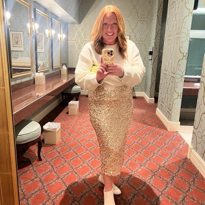 Love this skirt. It is very comfortable and not too tight so it covers my tummy. I usually wear an XL or XXL. As the smallest size in this skirt is XXL that is what I went with and it fits perfectly. After wearing it for New Years I plan on wearing it with a white t-shirt, denim jacket or an oversized cream sweater.