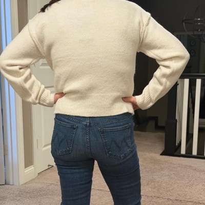 Sadly, this sweater would be lovely if it was not so short. I’m barely 5ft 1inch and this did not even reach my waist. It hits right below my rib cage and makes me look like a square. I wish this was a few inches longer as it. It’s so cute. I can’t recommend due to the severe cropped nature of this sweater, which is not in the description.
