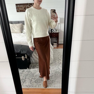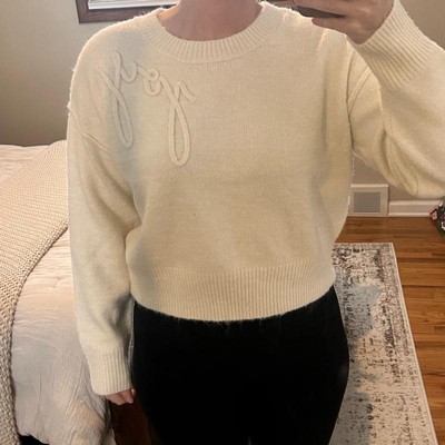 [This review was collected as part of a promotion.] I wear a size medium sweater. I have a 32 inch waist and a 36 inch hips. I have a 36C bust. This size medium sweater was a little big on me so I would recommend going one size down. I absolutely loved the cream color of the sweater. The beautiful embroidered lettering of joy on the sweater is perfect for the holiday season. This is a very high quality sweater. It felt soft and comfortable. It is a short sweater so if you like that style, this is perfect for you.