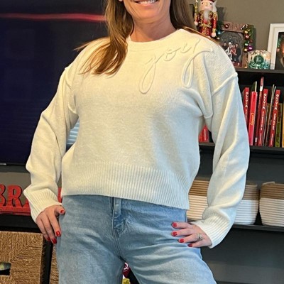 [This review was collected as part of a promotion.] I ordered this sweater for myself in a size medium. I typically wear a medium in my clothes, and I am 5’7”. I really like the cream color of this sweater, it’s a perfect shade to go with anything and it is festive. The ‘joy’ appliqué is really nice and makes the sweater looks high end. Sweater is fairly warm. My issue with the sweater was that it was a bit itchy, which I guess could be helped by wearing a shirt underneath.