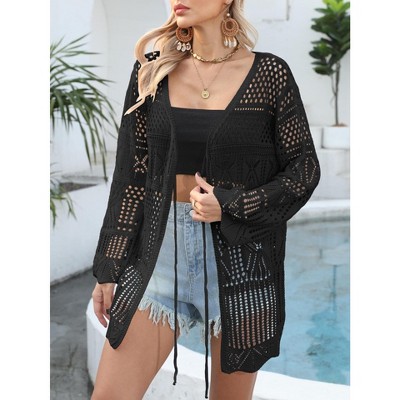 • Features: Y2K, crochet, hollow out, long bell sleeve, wide boat neck, drop shoulder, cropped length, bikini cover up
