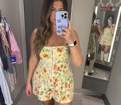 This romper is super cute and girly! Perfect for spring/summer. I’m 5’2, 145 pounds, and I purchased a small. I usually get a medium when wearing other brands, but I always size down when buying target clothes because they run a little big to me. So, if you like your clothes fitted, I recommend sizing down. I got the baby blue, but I’m thinking about buying the light yellow floral as well 🥰