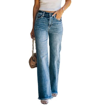 A flattering silhouette that's suprisingly versatile.High Rise. Zip Fly. Rigid Medium Wash Denim. Mild Distressing. Wide Leg. Raw Hem With Stay Stitch. 98% Cotton, 2% Spandex. True to Size.