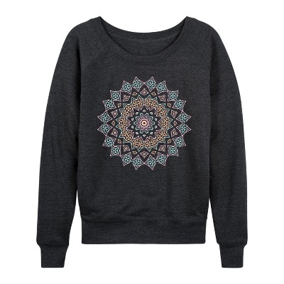 Women's Instant Message Black Cat On Mandala Moon Lightweight French Terry Wide Neck Long Sleeve Graphic Shirt - Heather Charcoal - X-Large