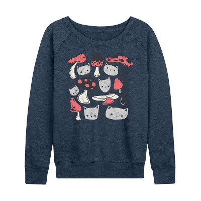 Women's Instant Message Cat Mushroom Lightweight French Terry Wide Neck Long Sleeve Graphic Shirt - Heather Indigo - Small